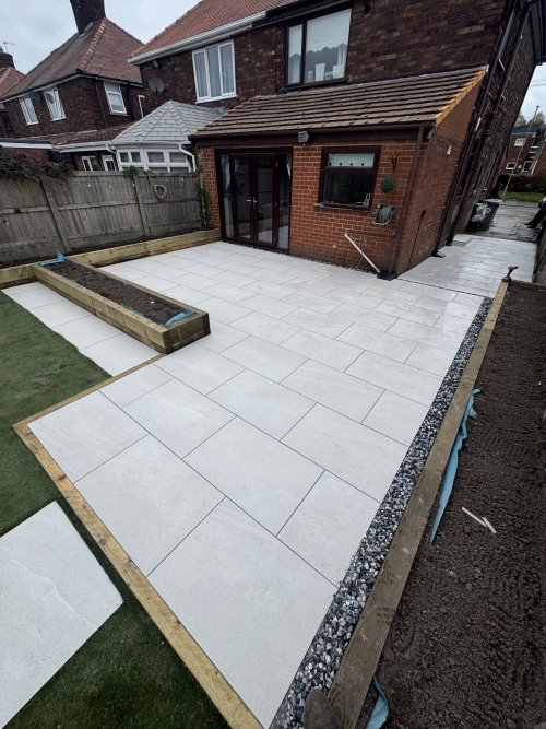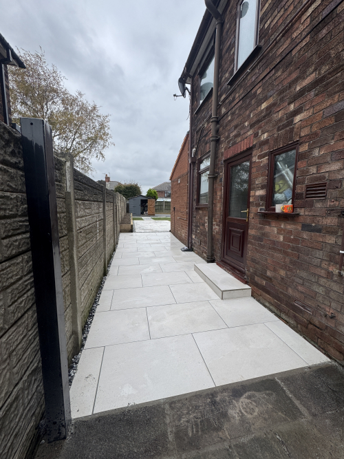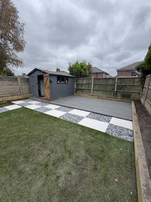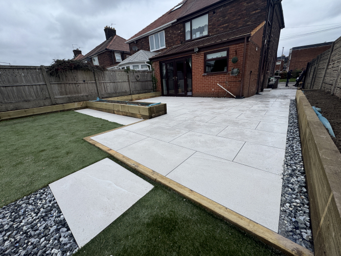 Together we designed a space that’s stylish yet practical, with a sleek porcelain paving, artificial lawn for year round greenery, and a contemporary stepping stone pathway that ties it all together beautifully.
